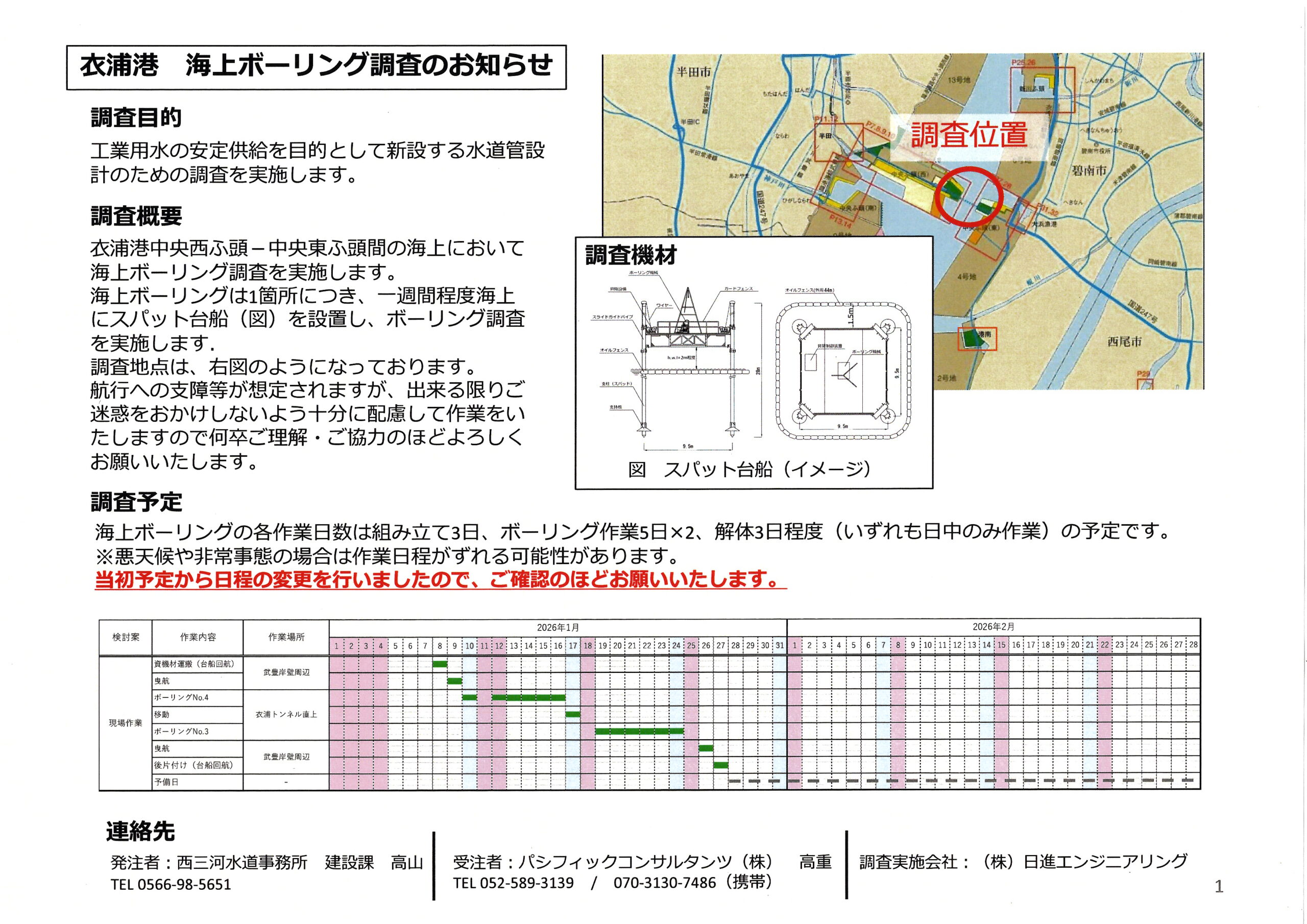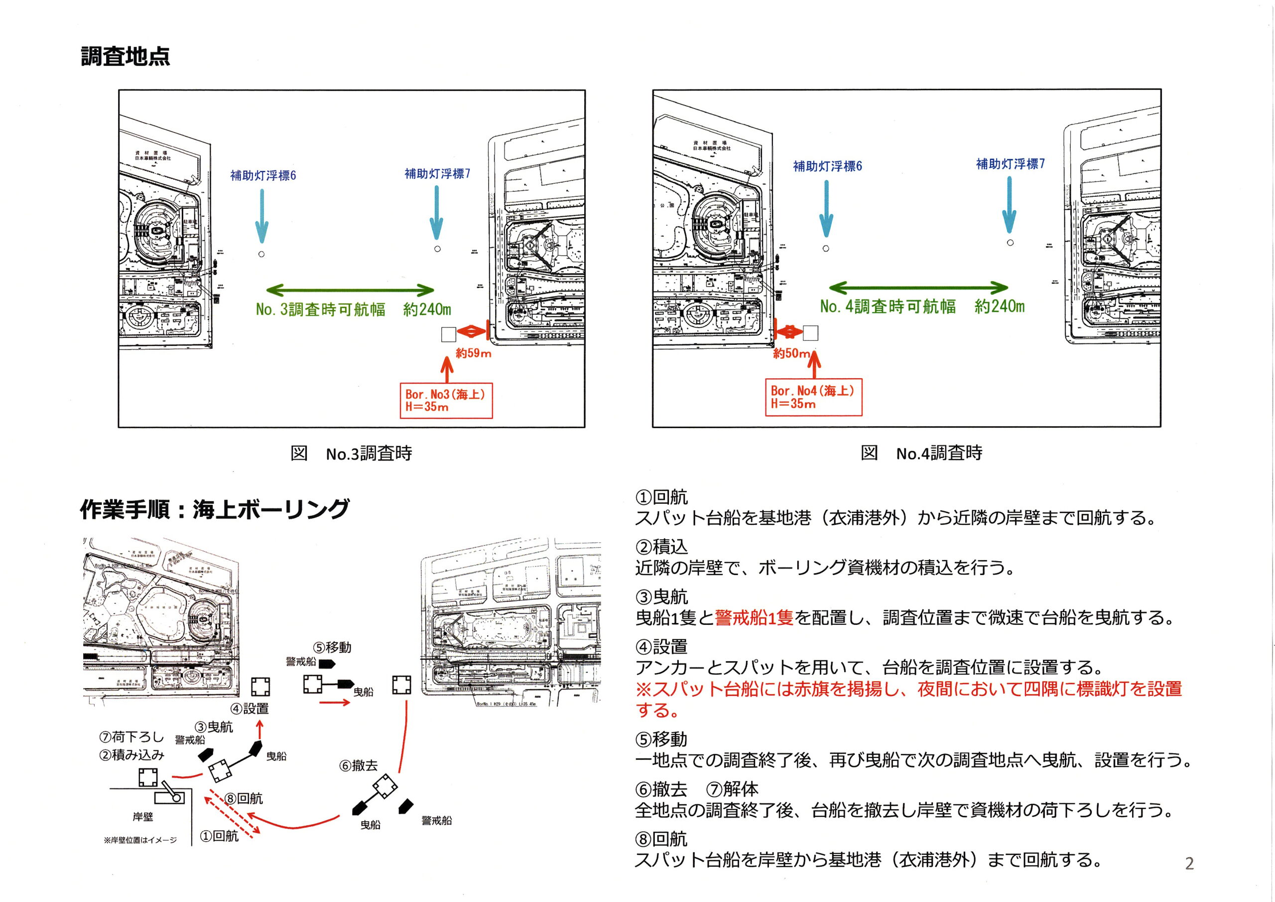 先日周知させていただいた海上ボーリング調査について、実施行程の変更及び作業手順(位置)の再調整のお知らせがありました。