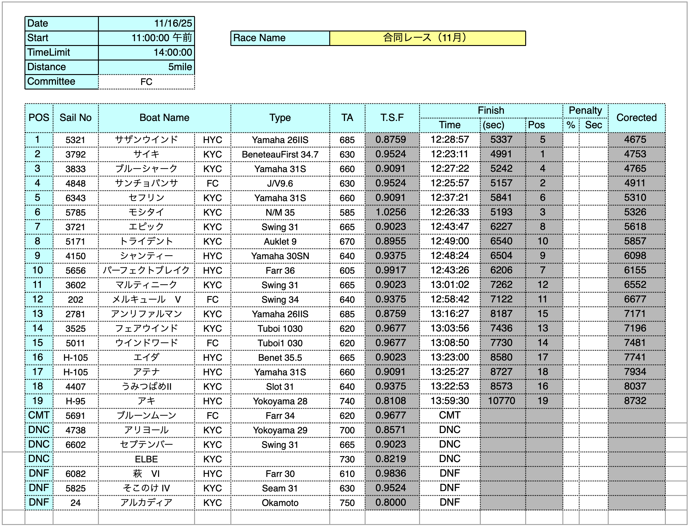 11月16日の衣浦合同レースの結果です。