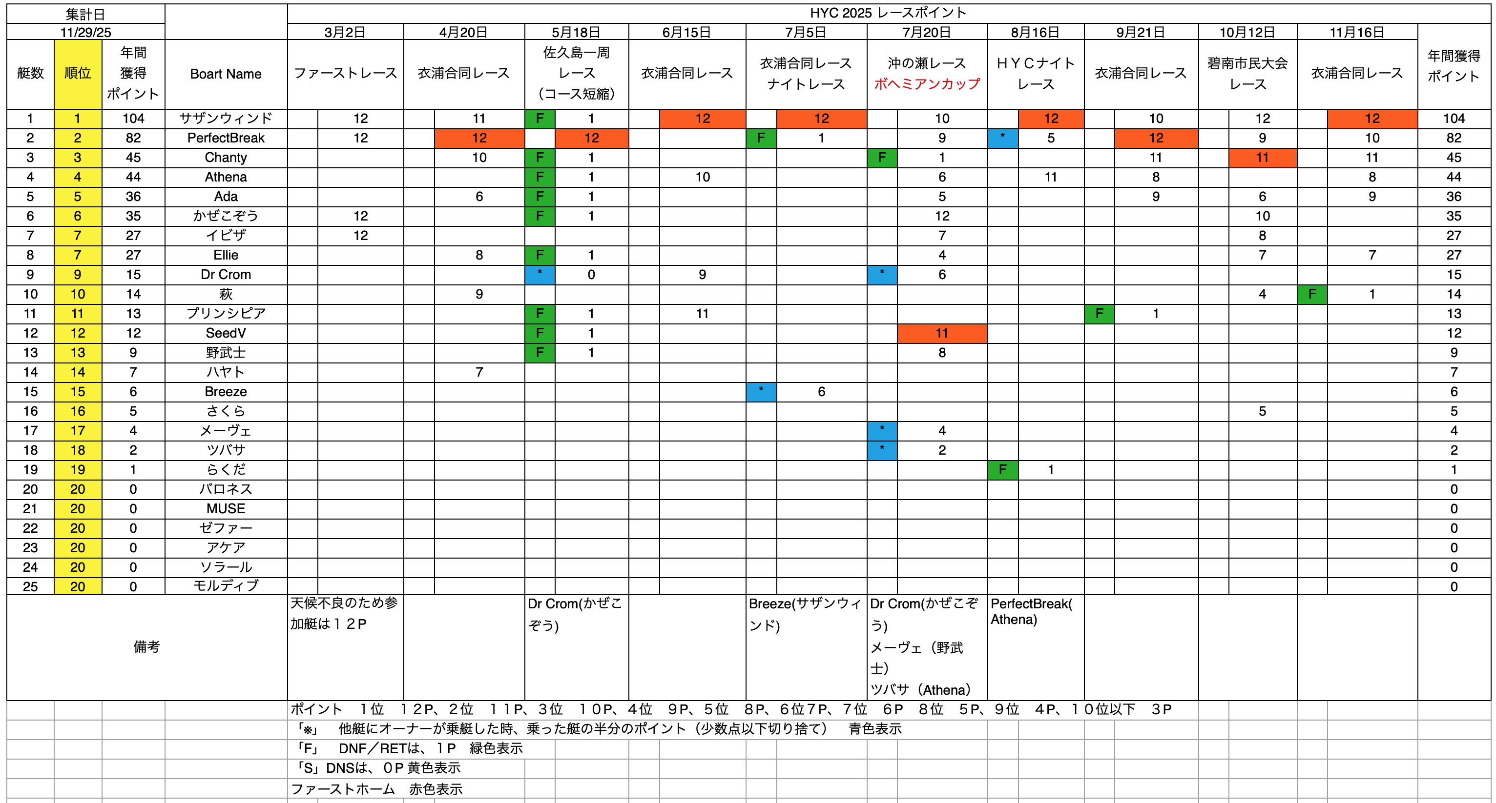 2025年レースポイント 2025.11.29 2025年のレースポイントが出ました。今年の年間順位表です。 (文字が小さくて読めない方は、表を右ボタンでクリックしてメニューを開き「名前を付けて画像を保存」を選択して頂くとJpegでダウンロードすることが出来ます) レース副委員長 舟橋勝章 Share